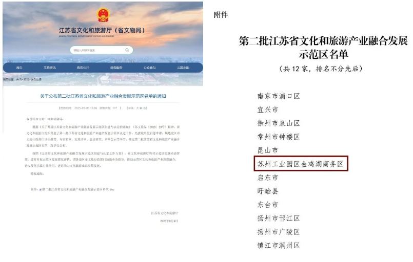 近日,省文化和旅游廳公布第二批江蘇省文化和旅游產(chǎn)業(yè)融合發(fā)展示范區(qū)名單,全省共有12家單位入圍,蘇州工業(yè)園區(qū)金雞湖商務(wù)區(qū)上榜。
