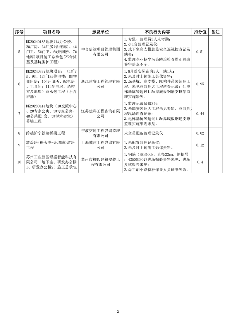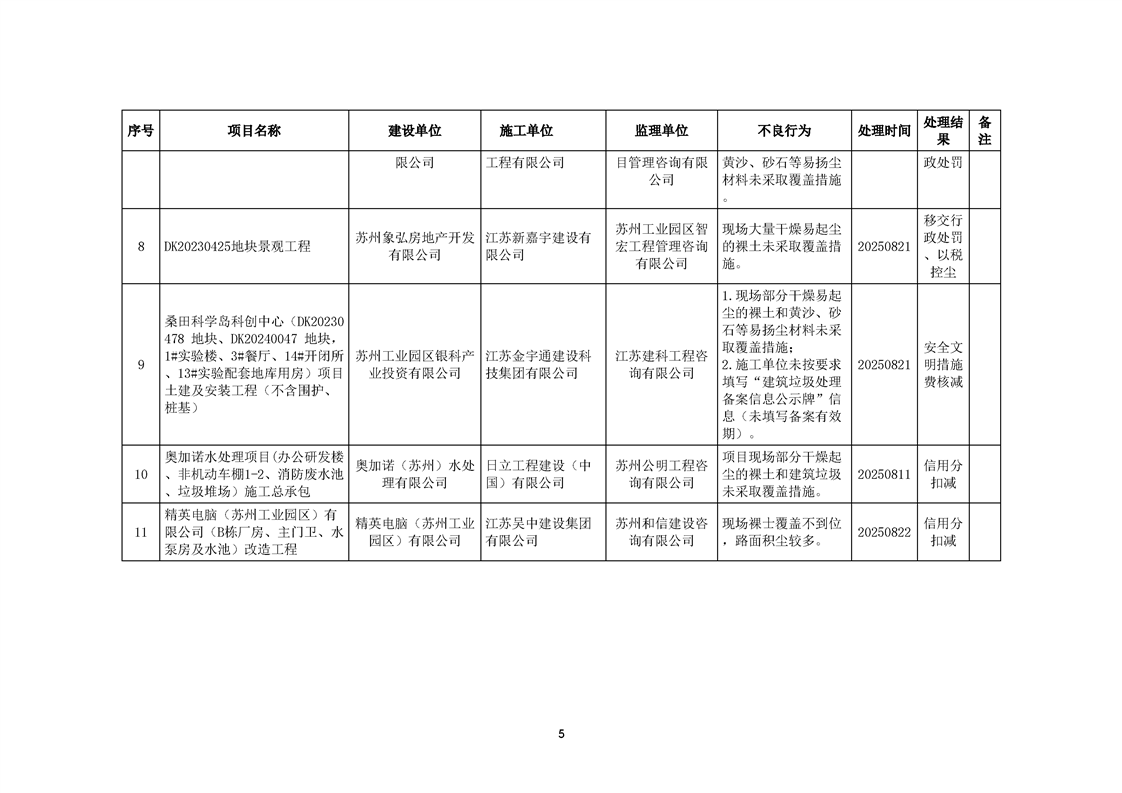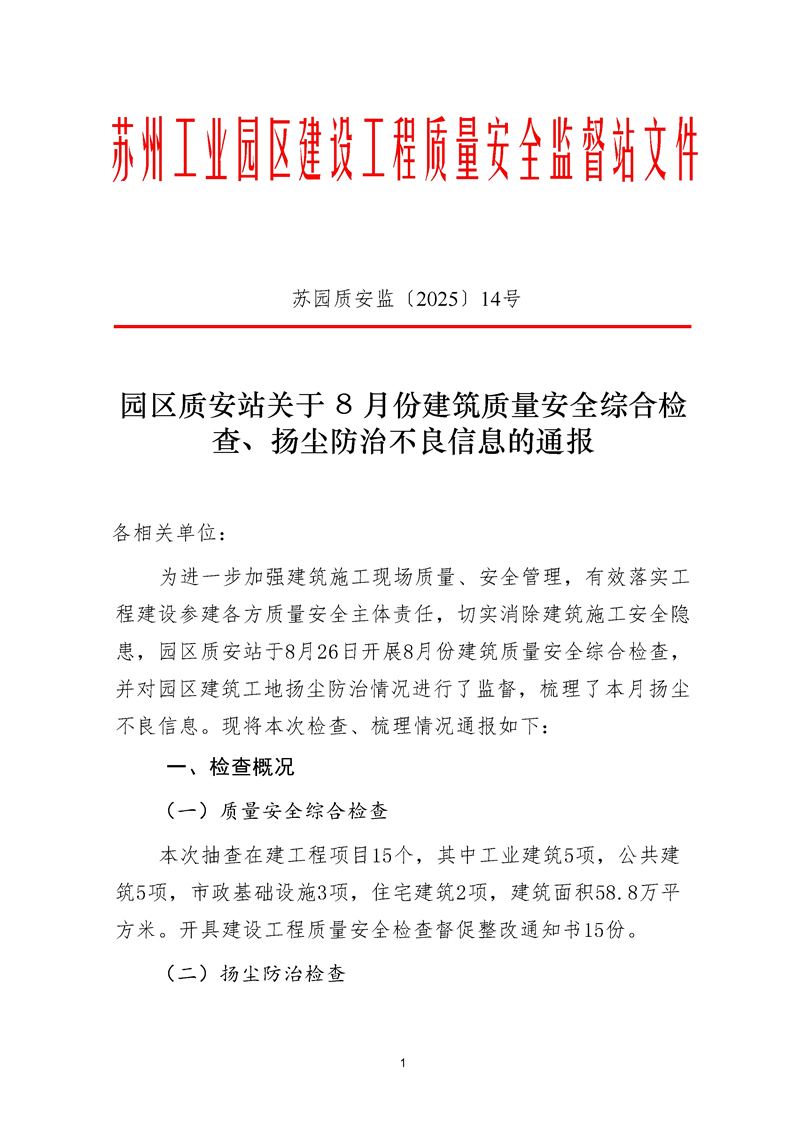 園區質安站關于8月份建筑質量安全綜合檢查、揚塵防治不良信息的通報