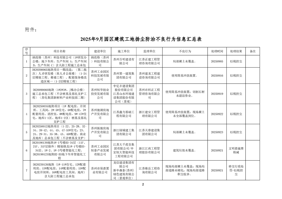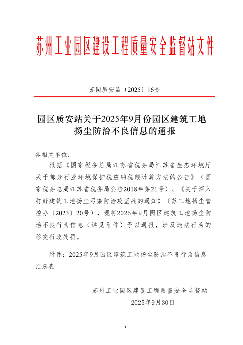 園區(qū)質安站關于2025年9月份園區(qū)建筑工地揚塵防治不良信息的通報