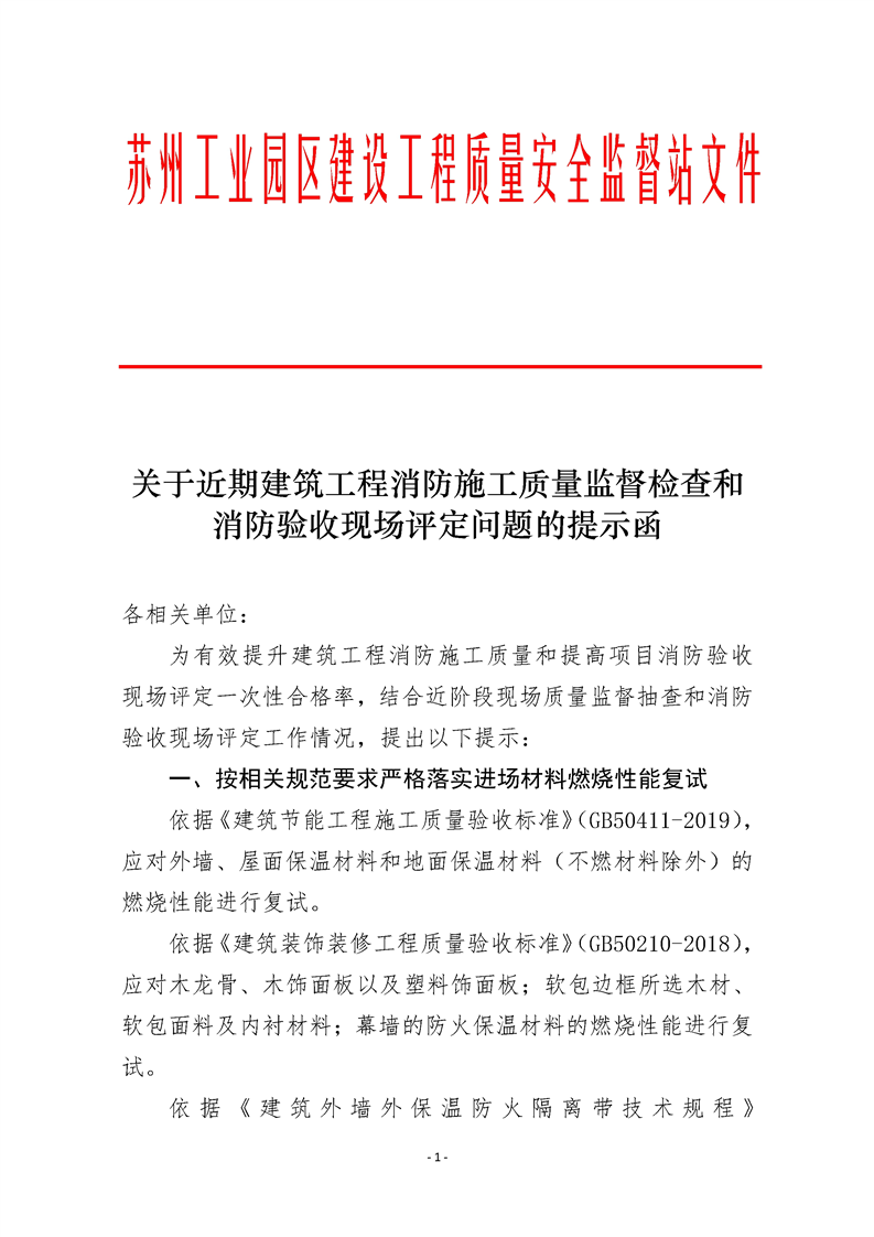 關(guān)于近期建筑工程消防施工質(zhì)量監(jiān)督檢查和消防驗收現(xiàn)場評定問題的提示函