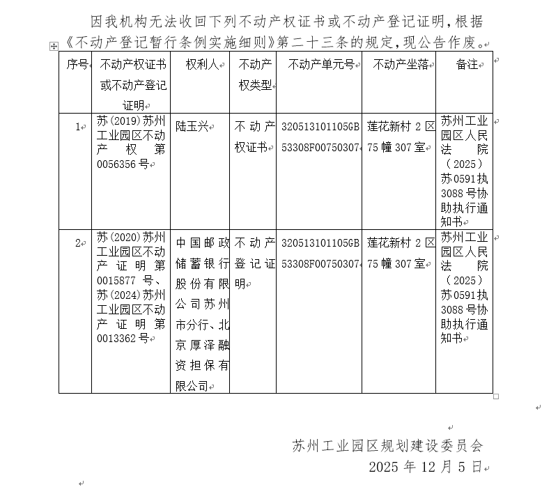不動產權證書/登記證明作廢公告蘇園 證廢字2025(0191)號(蓮花新村2區75幢307室)