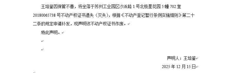 關(guān)于蘇州工業(yè)園區(qū)沙浜路1號北極星花園5幢702室20180065738號不動產(chǎn)權(quán)證書遺失聲明