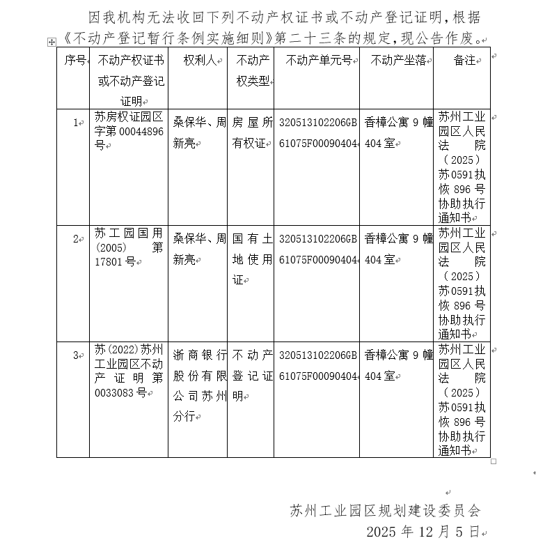 不動產權證書/登記證明作廢公告蘇園 證廢字2025(0193)號(香樟公寓9幢404室)