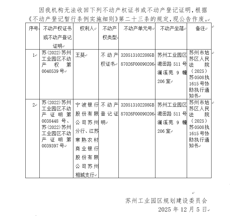 不動產(chǎn)權(quán)證書/登記證明作廢公告蘇園 證廢字2025(0196)號(瀾溪苑9幢206室)