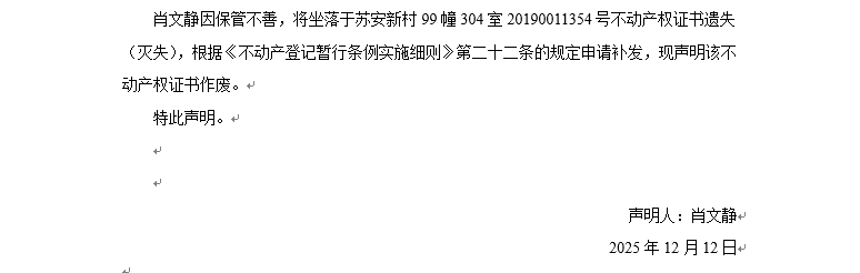 關于蘇安新村99幢304室20190011354號不動產權證書遺失聲明