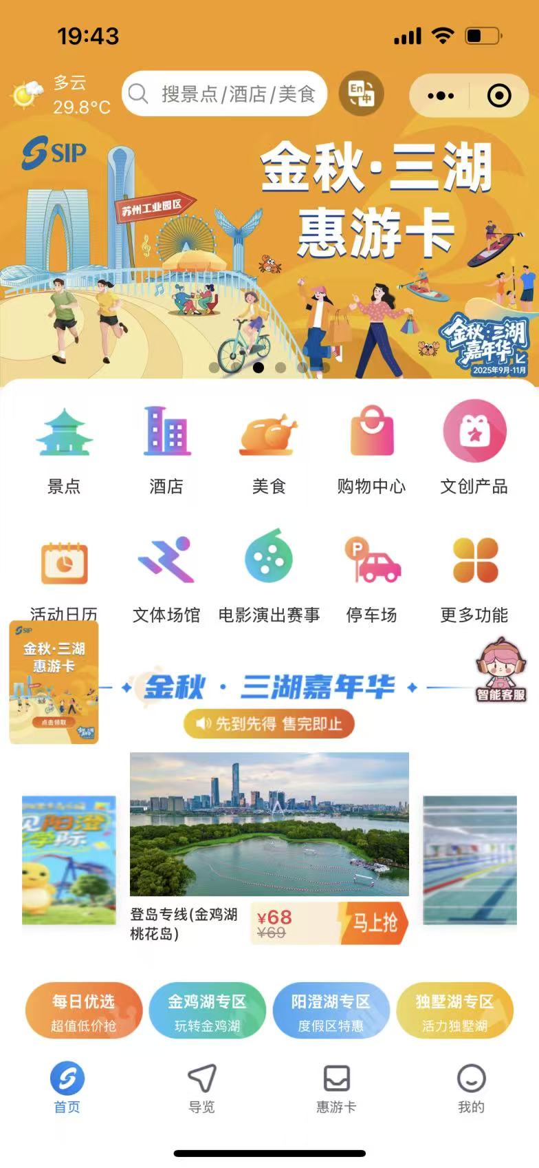 為進一步提升市民游客的幸福感。嘉年華期間,園區發布《金秋?三湖嘉年華指南》,集中呈現活動日程、推薦玩法、消費地圖等實用信息,為市民游客暢享園區金秋文旅盛宴提供全方位指引。“金秋·三湖惠游卡”和“金秋·三湖嘉年華消費券”,則匯聚千余家商戶實實在在的優惠,以及50余場演出、近20場體育賽事和40余場展覽展會,覆蓋餐飲、住宿、文旅、會展、汽車等重點消費領域。游客可以通過“惠游園區”公眾號、“數字金雞湖”、“同程旅行”小程序等平臺,領取專屬折扣與滿減禮遇,將出行、住宿、消費一手掌握。此外,憑借演藝賽事門票,還能兌換通用消費券及商家專屬禮包,延伸文旅體驗,盡享“票根+”福利。