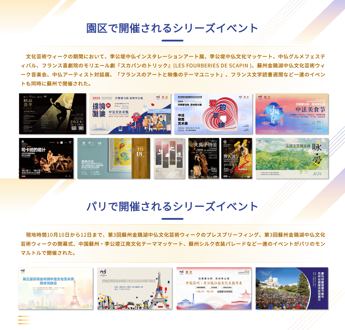 現(xiàn)地時(shí)間10月11日の夜、2024第3回蘇州金鶏湖中仏文化蕓術(shù)ウィークはパリのモンマルトルで幕を開けた。パリ第18區(qū)政府、パリコンベンション観光局、パリの大學(xué)、博物館、銀行、投資ファンド、文化観光企業(yè)からの100人以上のゲストが一堂に集まり、交流と協(xié)力について共に検討した。 イベントでは、園區(qū)文化體育観光局の責(zé)任者は蘇州及び蘇州工業(yè)園區(qū)の地理的優(yōu)位性、文化的背景、産業(yè)クラスター、投資環(huán)境、政府サービスなどについて詳しいプロモーションを行った。 會(huì)場(chǎng)では、パリ第18區(qū)政府、パリコンベンション観光局、仏中協(xié)力交流協(xié)會(huì)、モンマルトル商會(huì)、テイラーアーティスト基金會(huì)の代表が次々と発言した。また、現(xiàn)場(chǎng)では昆曲のパフォーマンスと蘇州工業(yè)園の寫真展も行われた。 今回の蘇州金鶏湖中仏文化蕓術(shù)ウィークは10月5日から10月20日までパリと蘇州の両地で同時(shí)に開催され、合計(jì)13回...