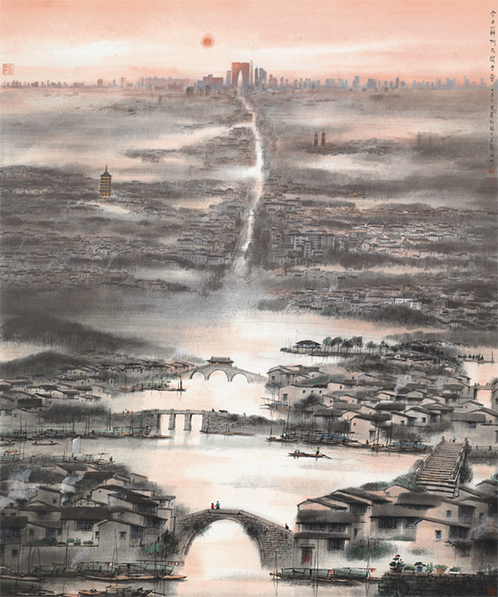 楊明義是蘇州籍畫家,他在80歲高齡創作的水墨作品《今日蘇州人間天堂》在此次展覽中亮相。該作品由近及遠,描繪出蘇州古今不同的時代風貌——既有小橋流水、古塔園林,也有蘇州工業園區的繁華盛景,體現了江南水鄉的發展變遷?!拔胰ミ^新加坡,也因為藝術的淵源,對新加坡有著深厚的感情。藝術需要交流,通過一次次互動,相信未來中新文化合作必將結出更加豐碩的成果。”楊明義說。