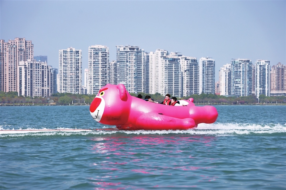昨日是清明假期最后一天,眾多市民游客在園區月光碼頭體驗橡皮艇游樂項目,感受飛馳水面的感受。(視覺蘇州供圖)