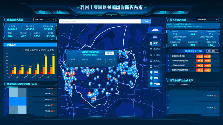 為進一步筑牢防非堅實防線,園區積極運用現代信息技術手段加強監測預警。活動中,由園區金融發展和風險防范局牽頭建設的園區金融風險防控系統正式上線,整合工商、警情等44類數據,疊加企業征信評分,運用9個維度、96個細化指標,為全區超14萬家企業進行科學賦分,進行分級分類處置。系統全程記錄監測預警、研判定級、分類處置情況,構建風險企業閉環管理模式,實現風險隱患一屏統覽、處置流程一圖掌控。