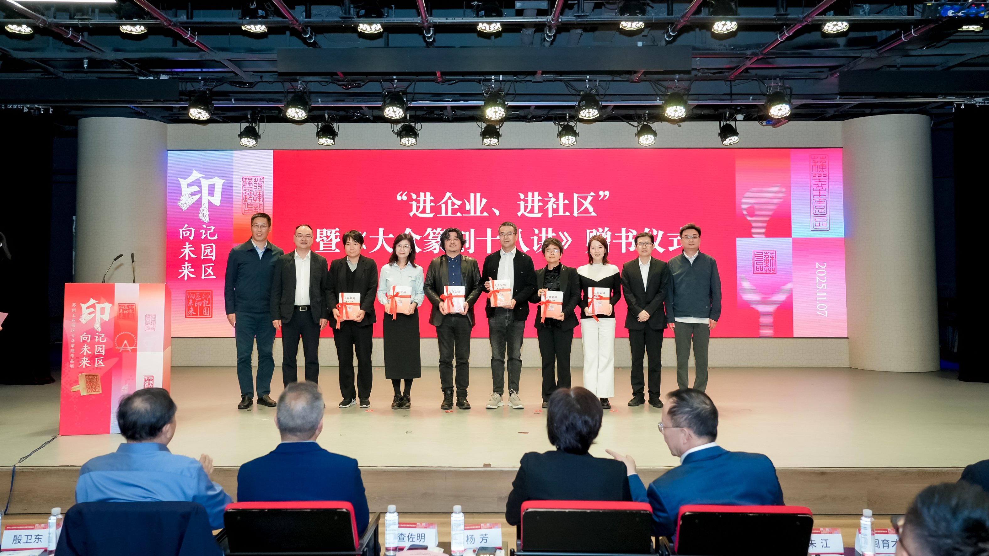 開幕活動上蘇州市委宣傳部、蘇州工業園區管委會、蘇州大學、中國職工文化體育協會等單位領導,共同在《一張藍圖繪到底》園區全景圖卷軸上鈐印,宣布展覽啟幕。現場同步啟動了“印六進”系列推廣活動,包括“進校園”暨沙畫共創、“進企業、進社區”暨《大眾篆刻十八講》贈書,以及“進景區、進商業、進國際”暨“‘走讀三湖·印證風華’跟著篆刻去旅行——金秋·三湖嘉年華”等系列活動。