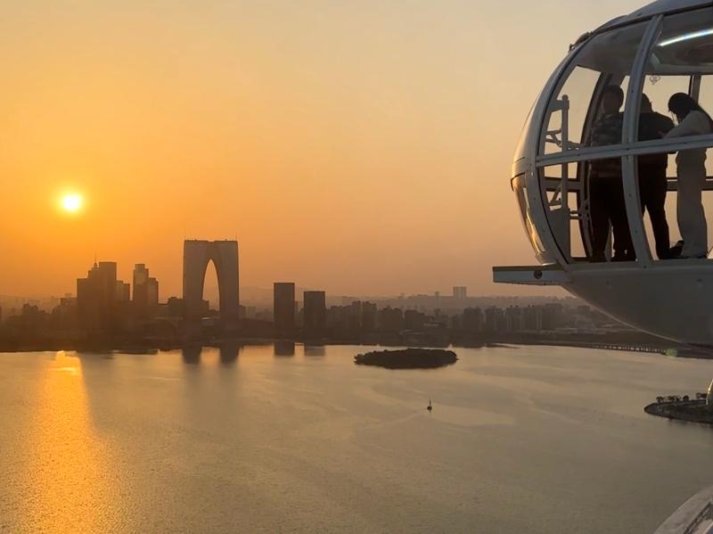 日落時分,不少市民游客前來體驗(yàn),太空艙內(nèi),洋溢著歡聲笑語。孩子們興奮地貼在窗邊,好奇地打量著逐漸變小的地面,父母向他們輕聲講述著窗外的風(fēng)景。情侶們緊緊相依,抓住每個瞬間,用相機(jī)定格甜蜜。隨著摩天輪緩緩上升,金雞湖的春日美景如畫卷般在眼前徐徐鋪展,夕陽將湖面染成金黃,波光粼粼。當(dāng)艙內(nèi)廣播提示摩天輪即將到達(dá)最高點(diǎn),大家緊張又興奮,紛紛站了起來。極目遠(yuǎn)眺,湖中央桃花島綠意蔥蘢,宛如世外桃源;金雞湖06驛站靜靜矗立,見證著人來人往的繁華;東方之門作為蘇州的城市地標(biāo),以其獨(dú)特的造型在高樓間格外醒目,盡顯現(xiàn)代都市魅力。多種景致交織,將歷史古韻與現(xiàn)代都市風(fēng)情完美融合,園區(qū)的韻味展露無遺。