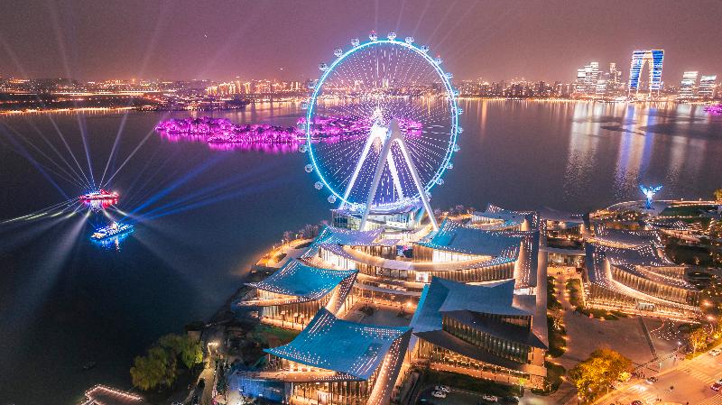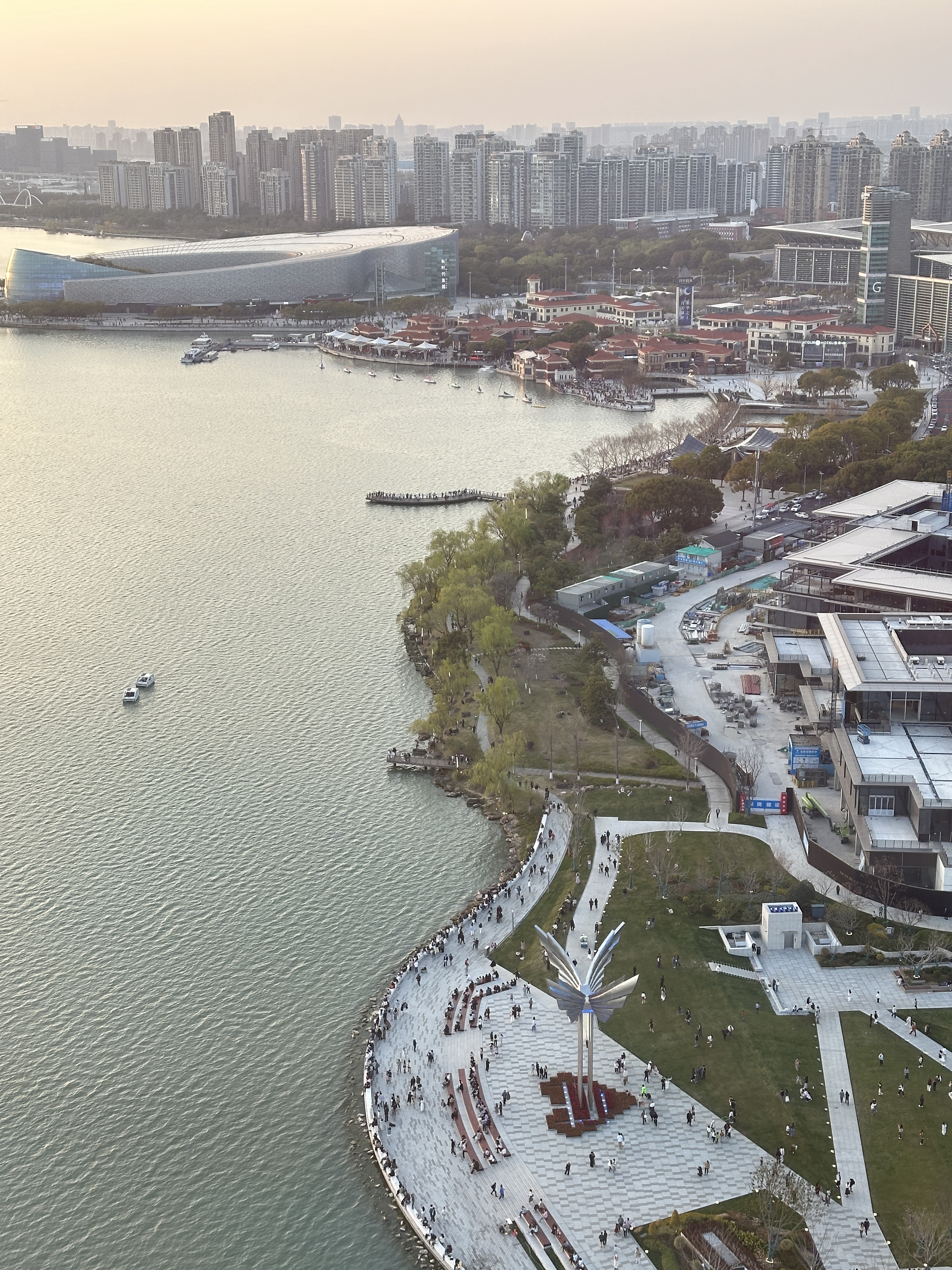 從摩天輪上俯瞰,飛翔雕塑下,春日游湖人潮洶涌,街道上車水馬龍,城市的蓬勃生命力撲面而來;金雞湖平靜如鏡,湖面上帆船、游船往來穿梭,豐富的水上運(yùn)動與晚霞、城市天際線相映成趣,構(gòu)成了一幅悠然的畫面。