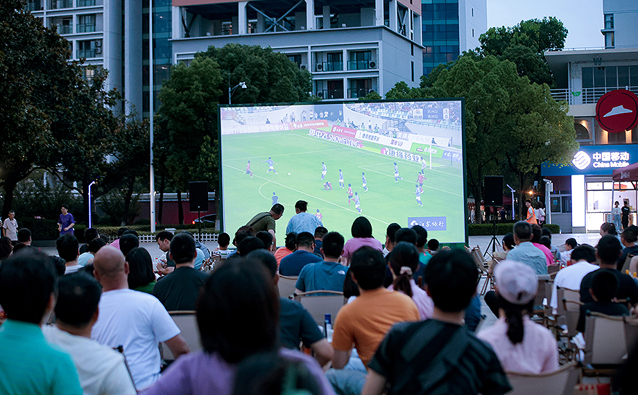 “開(kāi)始了,開(kāi)始了!”晚上7點(diǎn),隨著蘇州隊(duì)迎戰(zhàn)揚(yáng)州隊(duì)的哨聲響起,文星廣場(chǎng)的投影前爆發(fā)出陣陣歡呼聲。球迷們或坐或站,眼睛緊盯著屏幕上的每一次傳球、射門(mén)。每當(dāng)有隊(duì)伍發(fā)起進(jìn)攻,現(xiàn)場(chǎng)便掀起一陣聲浪。比賽開(kāi)始一分多鐘,蘇州隊(duì)的率先進(jìn)球更是在現(xiàn)場(chǎng)掀起第一波高潮。