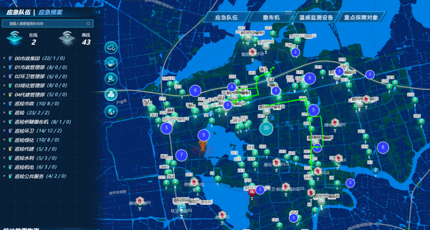 依托具備感知終端的監(jiān)測與調(diào)度平臺,市政服務(wù)集團構(gòu)建起“感知-傳輸-分析-應(yīng)用”的清雪除冰應(yīng)急保障管理閉環(huán)。系統(tǒng)一旦感知結(jié)冰風(fēng)險條件形成,能夠自動觸發(fā)預(yù)警信息,并生成作業(yè)建議,快速鎖定預(yù)警點位,啟動精準處置,改變傳統(tǒng)“憑經(jīng)驗、靠巡查”的被動模式。平臺界面實現(xiàn)預(yù)警點位、應(yīng)急隊伍、撒布機作業(yè)線路的多圖層疊加展示,支持應(yīng)急資源實時調(diào)度與動態(tài)跟蹤,應(yīng)急處置效能顯著提升。