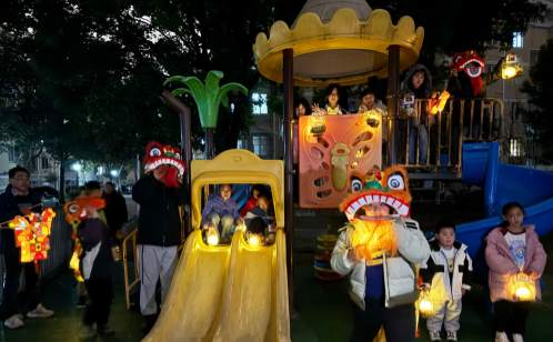 夜幕降臨,華燈初上,活動迎來了高潮——“燈火萬家·流動的‘XIN’福”花燈巡游由社區工作人員、志愿者以及手持自制花燈的親子家庭組成的巡游隊伍,宛如一條流動的燈河。巡游隊伍從生機盎然的社區蔬樂園出發,寓意著耕耘與收獲;隨后蜿蜒穿行至熱鬧的居民樓下,將祝福送到家家戶戶門前;最終抵達孩子們的樂園社區游樂場,這里是夢想起航的地方。一路上,由志愿者和社區青少年組成的舞獅隊與居民熱情互動,小獅子調皮地眨著眼睛,向大家拱手拜年。小朋友們熱情地向沿路的居民贈送精致的元宵燈籠一只只燈籠傳遞到居民手中,點亮了夜色,也溫暖了人心。