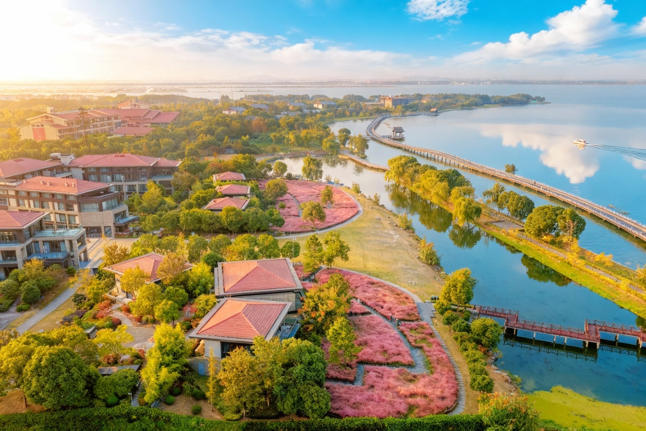 在園區,豐富的水陸體驗等待著游客探索。球迷可乘船登臨桃花島,或乘坐中央河觀光專線,無論是白天還是夜晚,都能沉浸式感受園區的非凡魅力;也可以打卡金雞湖環湖驛站,漫步金水灣棧橋,享受悠閑時光。此時的陽澄湖半島,楓葉正紅、銀杏鋪金、粉黛搖曳,風景宜人,同樣是市民游客休閑打卡的好去處。?
