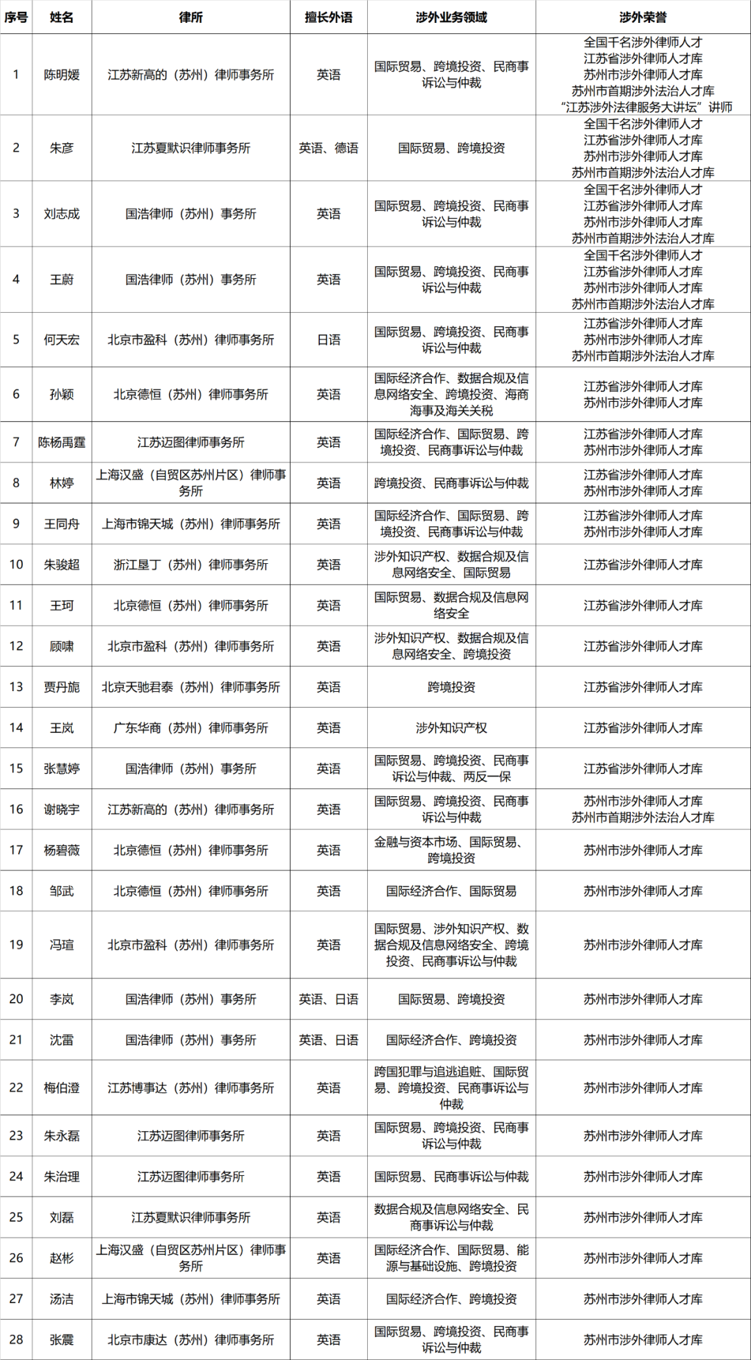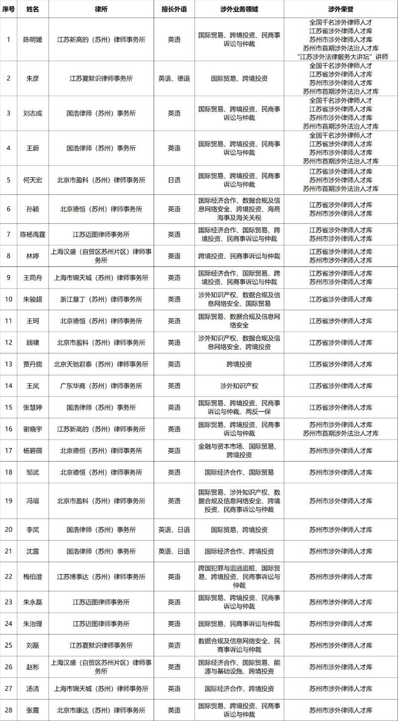 當前,全球貿易格局正在深度重構,為幫助企業有針對性獲取涉外法律服務,園區律協整理出入選全國、省、市涉外律師人才庫的園區律師,匯總成園區涉外律師人才庫,同時梳理相關涉外律師的擅長領域,推動實現企業涉外法律服務需求與服務供給的精準匹配。如需相關律師聯系方式可咨詢園區律師協會(聯系電話:0512-66683773)。
