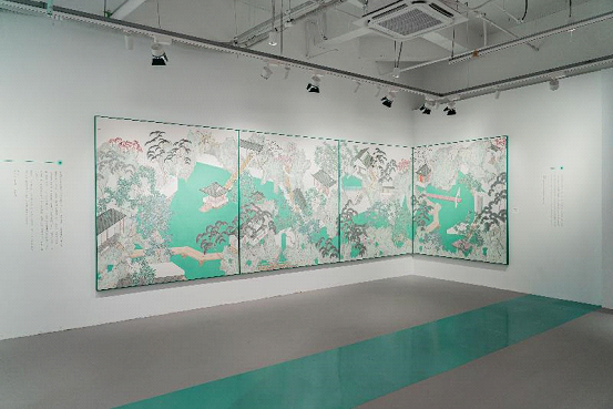 At the heart of the 150-square-meter exhibition space is Yao’s largest garden piece to date. This monumental work, displayed across four large screens, features a turquoise hue. While preserving elements of classical Suzhou-style gardens like Taihu Stone and winding paths, it presents motifs of modern architecture such as the Jinji Station and the “Flying” sculpture in SIP, creating a dynamic dialogue between traditional landscape aesthetics and contemporary visual language.
