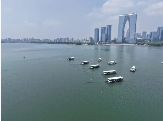 近日,市政服務集團在金雞湖、獨墅湖、陽澄湖等重點水域開展2025年度藍藻防控應急演練。本次演練以“多源突發、全域聯動”為情景設定,模擬多處核心水域同時出現藍藻集聚。演練中,城維人員依托高空無人機巡航,結合巡視員開展全域巡查,迅速完成藻情發現和風險研判。精準調度28艘專業打撈船只和120余人的作業隊伍快速響應,高效開展“巡查預警-調度指揮-打撈處置-無害化處置”全鏈條標準化作業,為進一步配合生態環境部門做好藍藻防控下好“先手棋”。