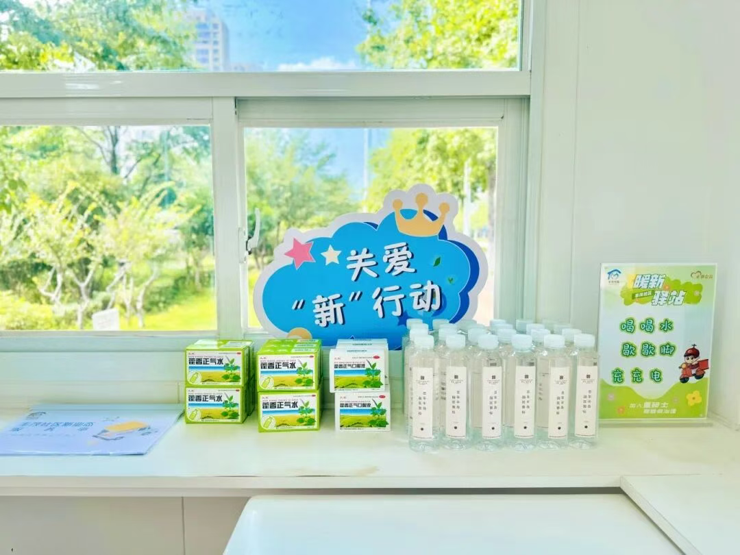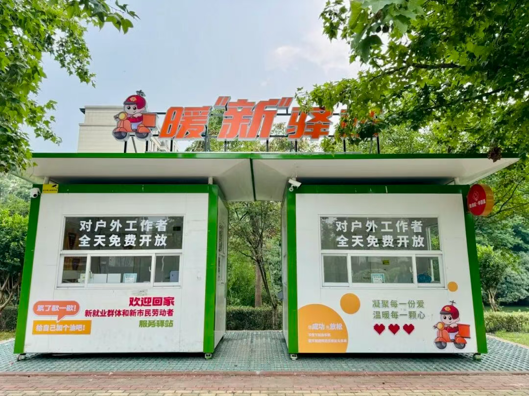 這個不大的空間,由兩座閑置亭子改造而成:空調(diào)送出徐徐涼風(fēng),充電插座的指示燈靜靜閃爍,墻上掛著共享雨傘,角落的便民箱里備有礦泉水、創(chuàng)可貼等物資。最讓騎手們滿意的是,驛站24小時開放,即便深夜下班,也能進來喝上一口熱水。