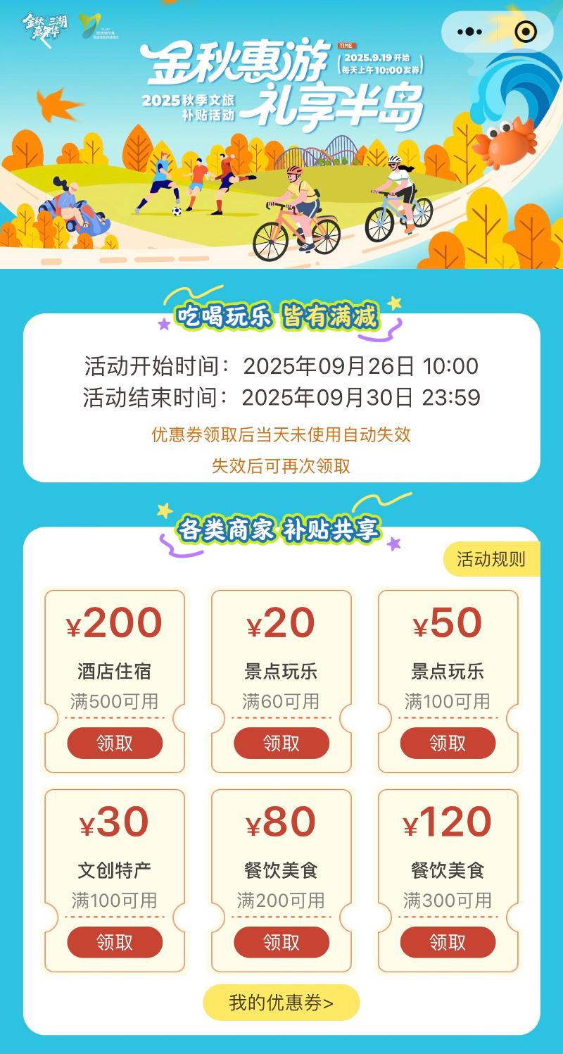 即日起至9月30日,每日10:00起,“惠游園區”小程序將限量發放文旅消費券,覆蓋餐飲、住宿、文創、娛樂等多個場景。市民游客只需注冊登錄小程序,進入文旅消費活動專題頁面,即有機會領取不同面額的優惠券,數量有限、先到先得。